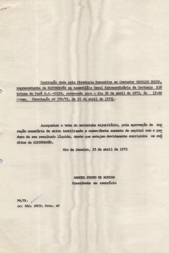 Documentos referentes à Assembleia Geral Extraordinária das Centrais Elétricas do Pará S.A. - CELPA, realizada em 23 de abril de 1973, tendo como ordem do dia o aumento do capital social e alteração dos estatutos sociais. Possui pauta da reunião, enviada a Oswaldo Rocha, representante da Eletrobras.