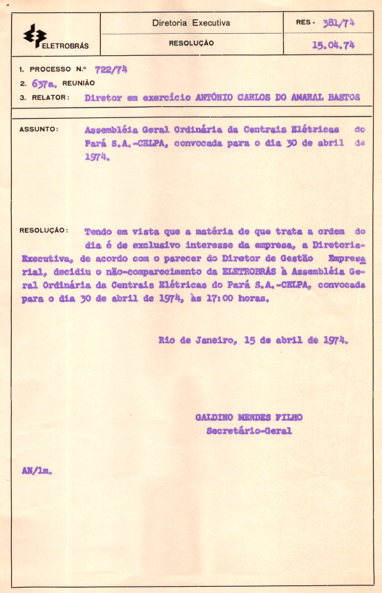Documentos referentes à Assembleia Geral Ordinária das Centrais Elétricas do Pará S.A. - CELPA, realizada em 30 de abril de 1974, tendo como ordem do dia a deliberação do balanço e relatório da diretoria, relativo ao exercício de 1973 e o respectivo parecer do conselho fiscal, preenchimento por meio de eleição de cargos da Diretoria, eleger os membros do conselho fiscal e seus suplentes para o próximo exercício e fixar os honorários da diretoria e do conselho fiscal. Possui pauta da reunião, enviada a Antônio Carlos do Amaral Bastos, representante da Eletrobras.