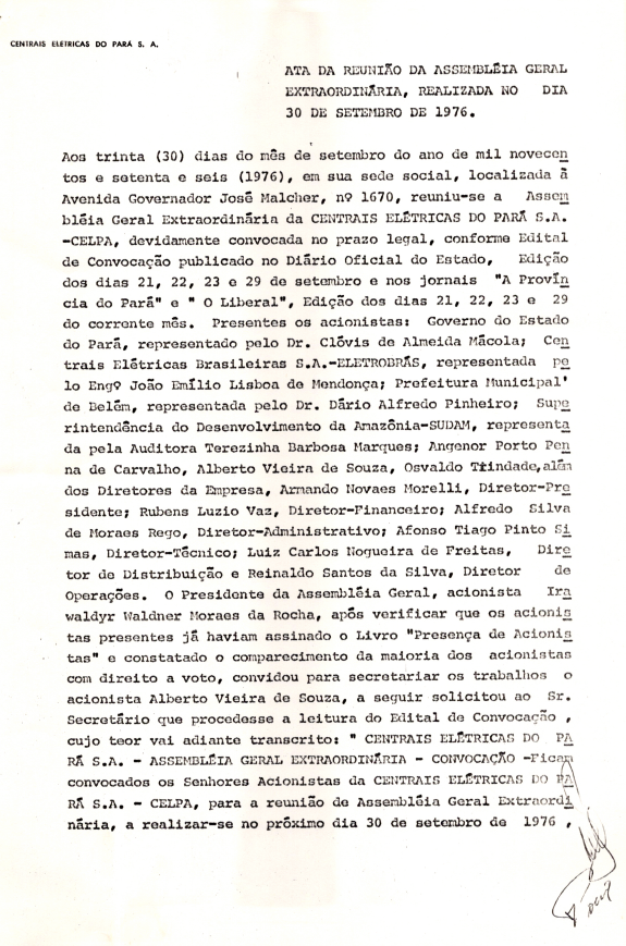 Registro de Assembleia Geral Extraordinária da CELPA de setembro de 1976