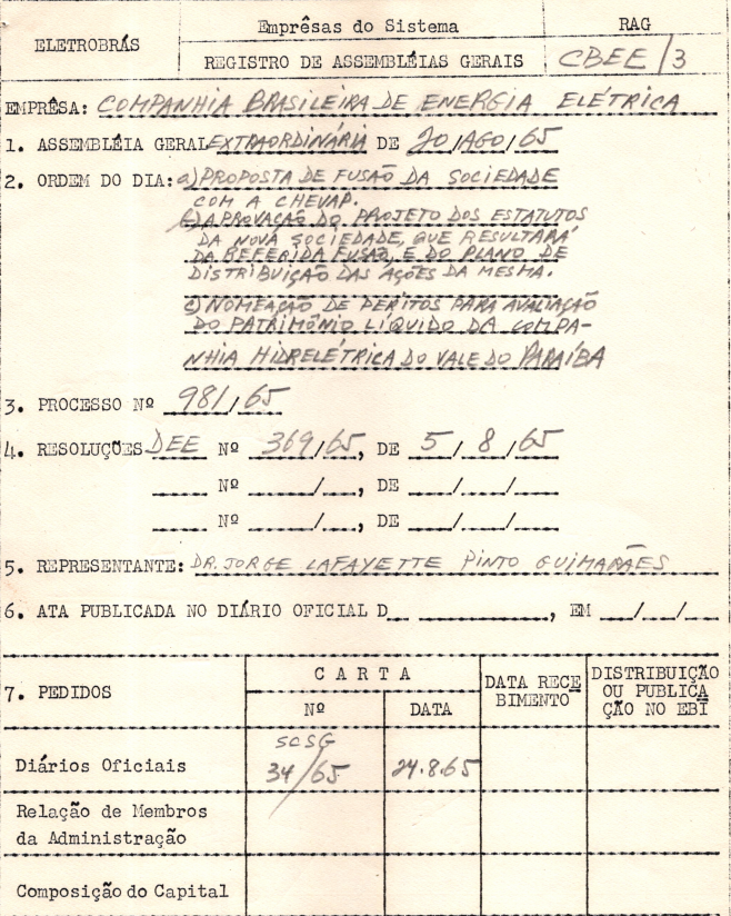 Registro de Assembleia da Companhia Brasileira de Energia Elétrica de agosto de 1965