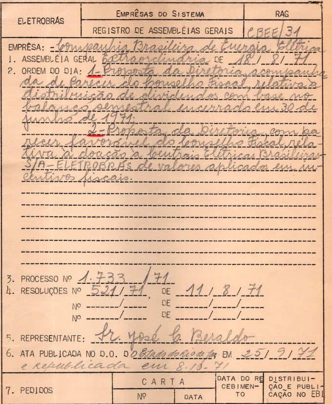 Registro da Assembleia Geral Extraordinária da CBEE de agosto de 1971
