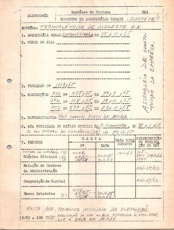 Documento referente à Assembleia Geral Extraordinária da Termelétrica Alegrete S.A, realizada em 25 de novembro de 1965, tendo como ordem do dia a eleição da primeira diretoria e do primeiro conselho fiscal e a aprovação de seus respectivos honorários.