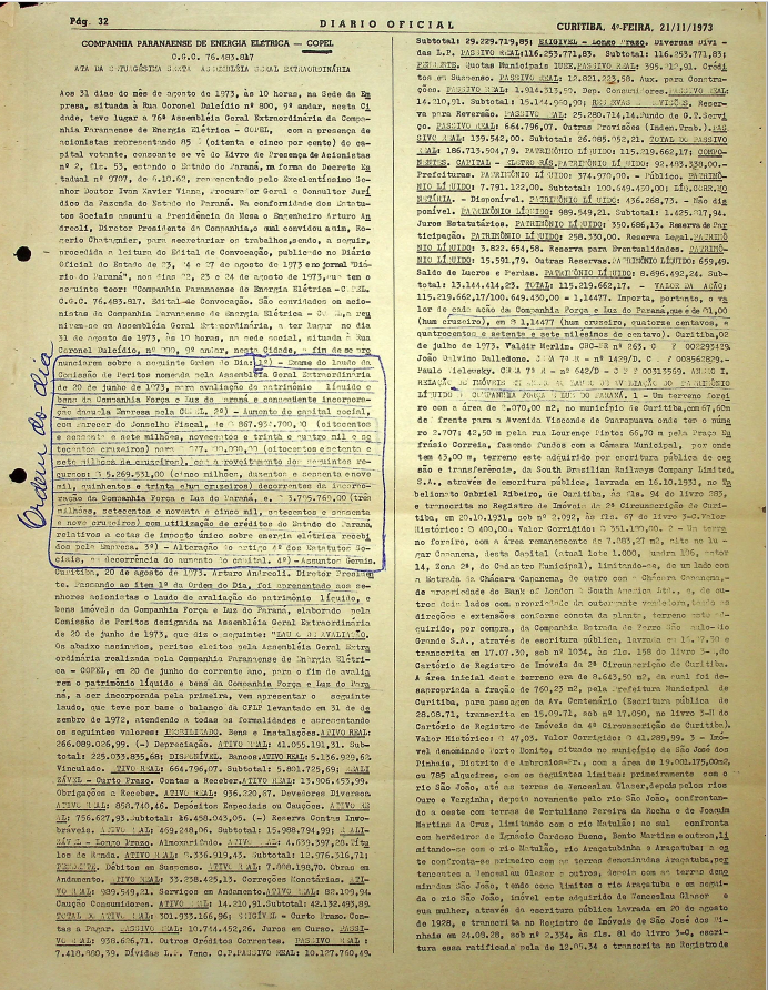 Registro de Assembleia Geral Extraordinária da COPEL de agosto de 1973