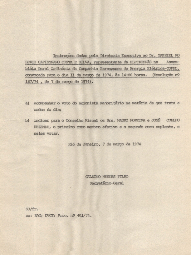 Documentos referentes à Assembleia Geral Ordinária da Companhia Paranaense de Energia Elétrica - COPEL, realizada em 11 de março de 1974, tendo como ordem do dia apreciar e deliberar sobre o relatório da Diretoria, o balanço geral, demonstrativo da conta de lucros e perdas e o parecer do Conselho Fiscal, referentes ao exercício de 1973, eleição dos membros do Conselho Fiscal, fixação dos respectivos honorários, e outros assuntos de interesse social. Inclui pauta encaminhada a Gabriel Roberto Capistrano Costa e Silva, representante da Eletrobras.