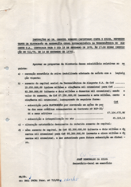 Documentos referentes à Assembleia Geral Extraordinária da Termelétrica Alegrete S.A, realizada em18 de setembro de 1970, tendo como ordem do dia a correção monetária do ativo imobilizado de acordo com a legislação vigente, aumento do capital social da Termoelétrica, subscrição pela Eletrobras por conversão em ações de parte de seus créditos, alteração estatuária decorrente do aumento de capital e outros assuntos de interesse da companhia. Possui pauta da reunião, enviada a Gabriel Roberto Capistrano, representante da Eletrobras.