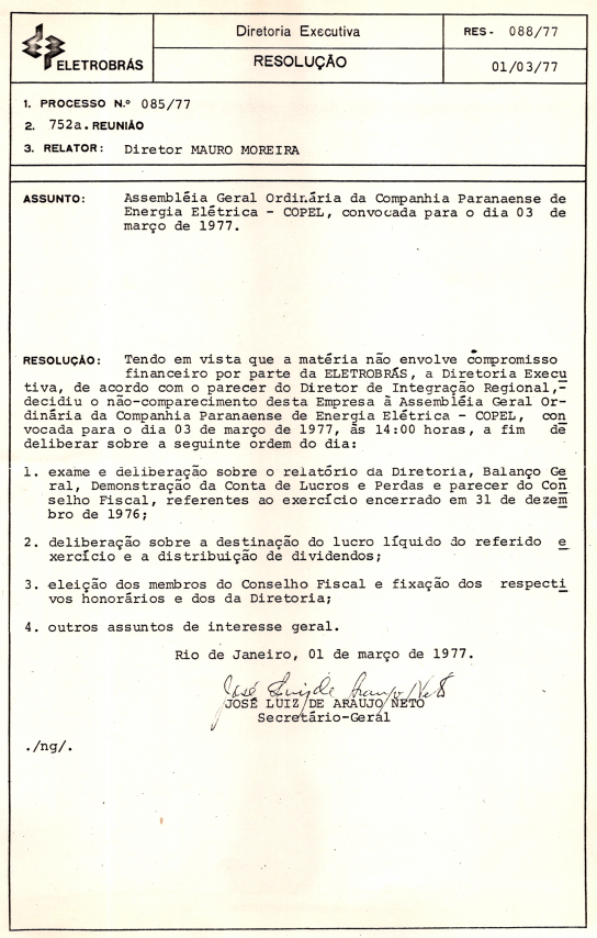 Registro de Assembleia Geral Ordinária da COPEL de março de 1977