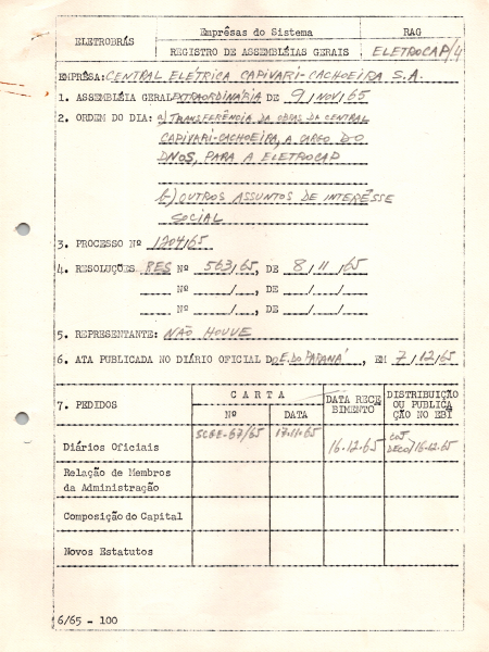 Documento referente à Assembleia Geral Extraordinária da Central Elétrica Capivari - Cachoeira (Eletrocap), realizada em 09 de novembro de 1965, tendo como ordem do dia a discussão a respeito dos juros fixados no art. 34 dos estatutos sociais, incidência da taxa de corretagem sobre o capital subscrito pelo fundo de desenvolvimento econômico administrativo pela CODEPAR, na AGE de 09/12/1964 e outros assuntos de interesse da companhia.