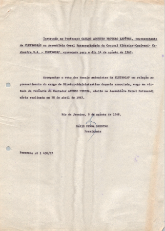 Documentos referentes à Assembleia Geral Extraordinária da Central Elétrica Capivari - Cachoeira (Eletrocap), realizada em 14 de agosto de 1968, tendo como ordem do dia o acompanhamento dos votos dos demais acionistas da Eletrocap em relação ao preenchimento do cargo de diretor administrativo daquela associada, vago em virtude da renúncia do contador Afonso Miessa, eleito na Assembleia Geral Extraordinária realizada em 28 de abril de 1967, e outros assuntos de interesse da companhia. Possui pauta da reunião, enviada a Carlos Augusto Brotero Lefèvre, representante da Eletrobras.
