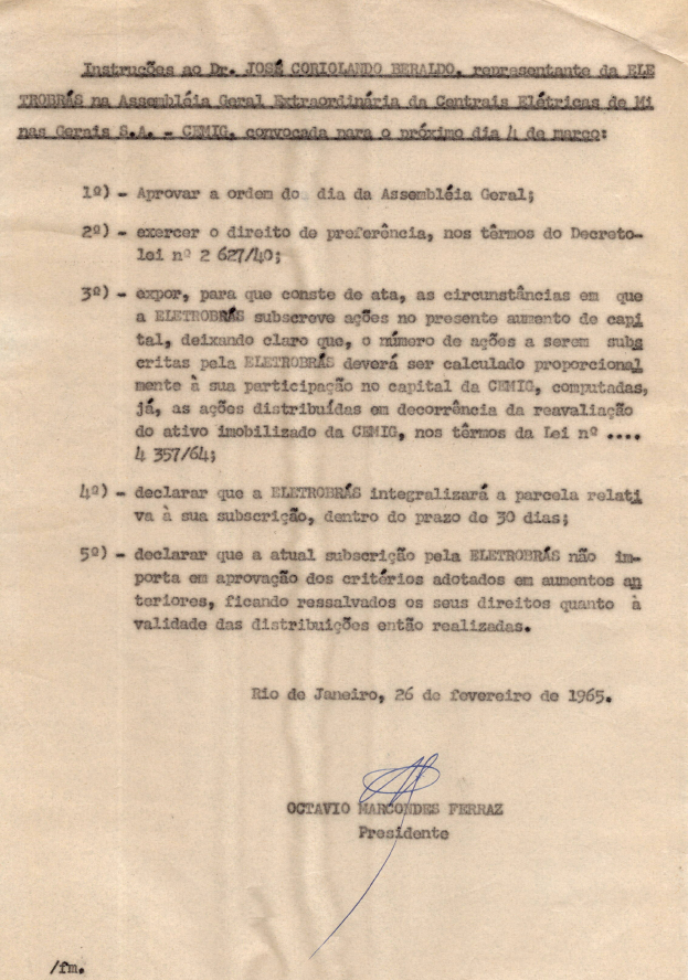 Documentos referentes à Assembleia Geral Extraordinária das Centrais Elétricas de Minas Gerais S.A. - CEMIG, empresa associada da Eletrobras, realizada em 04 de março de 1965, tendo como ordem do dia o aumento do capital social, e outros assuntos de interesse da companhia. Inclui pauta da referida Assembleia encaminhada a José Coriolando Beraldo, representante da Eletrobras.