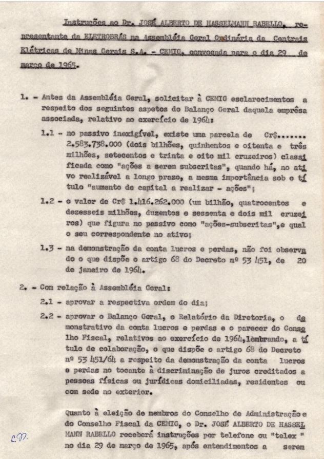 Documentos referentes à Assembleia Geral Ordinária das Centrais Elétricas de Minas Gerais S.A. - CEMIG, empresa associada da Eletrobras, realizada em 06 de abril de 1965, tendo como ordem do dia o aumento do capital social, e outros assuntos de interesse da companhia. Inclui pauta da referida Assembleia encaminhada a José Alberto de Hasselman Rabello, representante da Eletrobras.