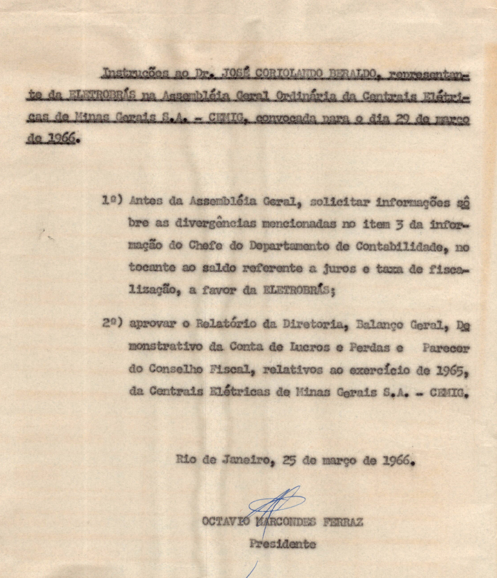 Documentos referentes à Assembleia Geral Ordinária das Centrais Elétricas de Minas Gerais S.A. - CEMIG, empresa associada da Eletrobras, realizada em 29 de março de 1966, que tinha como ordem do dia a leitura e votação do relatório da Diretoria, Balanço Geral, Demonstração da conta de lucros e perdas e parecer do Conselho Fiscal relativos ao exercício de 1965; eleição do Conselho Fiscal, fixação de remunerações, e outros assuntos de interesse da companhia.