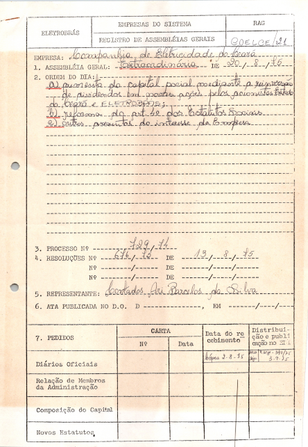 Documentos referentes à Assembleia Geral Extraordinária da Companhia de Eletricidade do Ceará - COELCE - ocorrida em 21 de novembro de 1972, tendo como pauta indicação do contador Ari Barcelos da Silva, aprovar proposta da Diretoria da Coelce que visa à elevação de seu capital social de Cr$ 337.609.416,00 para Cr$ 346.108.316,00, cujo aumento de Cr$ 8.498.900,00 será feito mediante subscrição de ações de corrente de créditos do estado do Ceará e da Eletrobras. No citado aumento de capital, subscrever e integralizar no ato, em nome da Eletrobras, a parcela de 5.343.328 e, ações preferenciais do valor nominal de Cr$ 1,00 cada uma, equivalente a Cr$ 5.343.328. Aprovar a alteração estatutária decorrente do aludido aumento de capital.