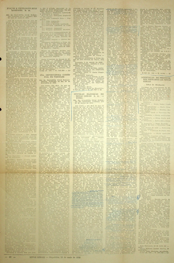 Documentos referentes à Assembleia Geral Ordinária das Centrais Elétricas de Minas Gerais S.A. - CEMIG, empresa associada da Eletrobras, realizada em 30 de abril de 1968, tendo como ordem do dia a verificação e aprovação do aumento de capital social deliberado na AGE de 30.12.1967, proposta da diretoria para correção monetária do ativo imobilizado, proposta da diretoria para novo aumento do capital social e modificação do valor nominal das ações, e outros assuntos de interesse da companhia. Inclui pauta da referida Assembleia encaminhada a Manoel Pinto de Aguiar, representante da Eletrobras.