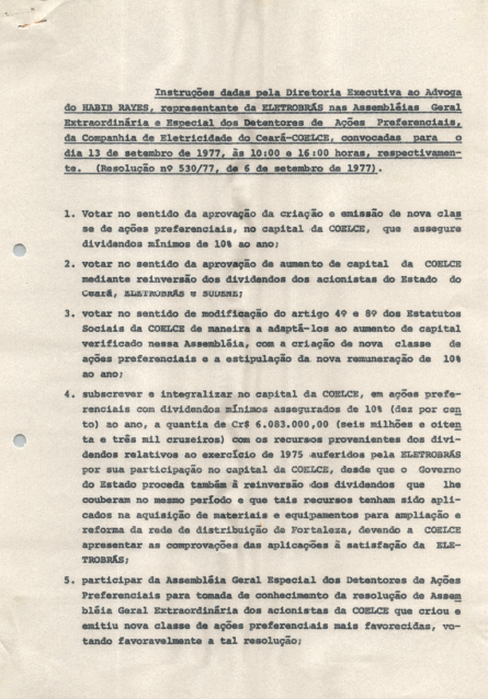 Documentos referentes à Assembleia Geral Extraordinária da Companhia de Eletricidade do Ceará - COELCE - ocorrida em 13 de agosto de 1977, tendo como pauta aprovação da criação e emissão da nova classe de ações preferenciais e aumento do capital da empresa.