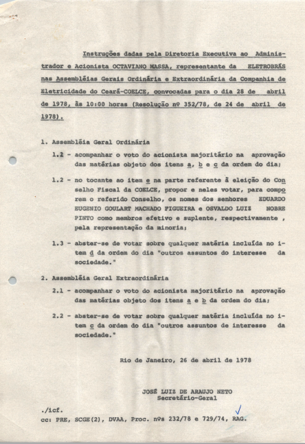 Documentos referentes à Assembleia Geral Extraordinária da Companhia de Eletricidade do Ceará - COELCE - ocorrida em 28 de abril de 1978, tendo como pauta acompanhar o voto de acionista majoritário na aprovação da matéria objeto dos itens a, b e c da ordem do dia. Referente ao item "e", na parte referente à eleição do Conselho Fiscal da Coelce, propor e neles votar, para comporem o referido Conselho, os nomes dos senhores Eduardo Eugenio Goulart Machado Figueira e Oswaldo Luiz Nobre Pinto como membros efetivo e suplente, respectivamente, pela representação da minoria. Abster-se de votar sobre qualquer matéria incluída no item "d" da ordem do dia. Acompanhar o voto do acionista majoritário na aprovação dos itens "a" e "b" e abster-se de votar sobre qualquer matéria incluída no item "c" da ordem do dia.