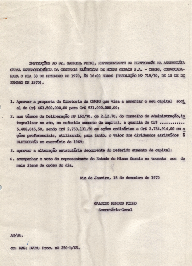 Documentos referentes à Assembleia Geral Ordinária das Centrais Elétricas de Minas Gerais S.A. - CEMIG, empresa associada da Eletrobras, realizada em 30 de dezembro de 1970, tendo como ordem do dia autorização, verificação e aprovação do aumento de capital social, fixação de honorários da diretoria, alienação de imóveis, e outros assuntos de interesse da sociedade. Inclui pauta da referida assembleia encaminhada a Gabriel Petri, representante da Eletrobras.