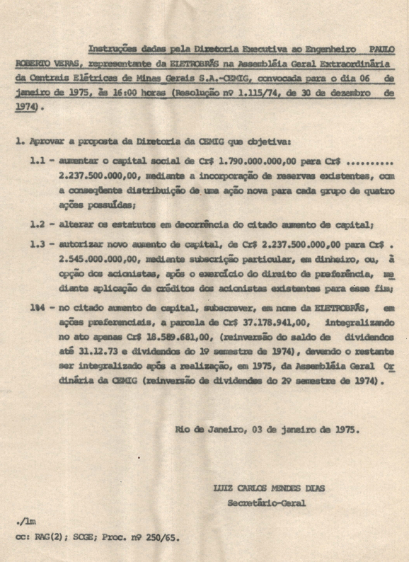 Registro da Assembleia Geral Extraordinária da CEMIG de janeiro de 1975
