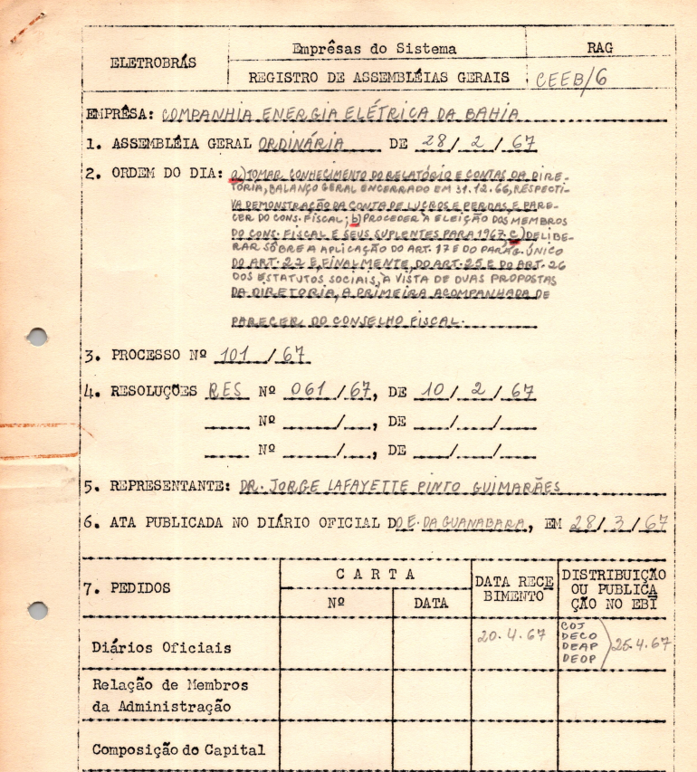 Documentos referentes à Assembleia Geral Ordinária da Companhia Energia Elétrica da Bahia - CEEB - ocorrida em 17 de abril de 1967, tendo como pauta Relatório de contas da Diretoria, Balanço Geral encerrado em dezembro de 1966 e eleição dos membros do Conselho Fiscal e seus suplentes.