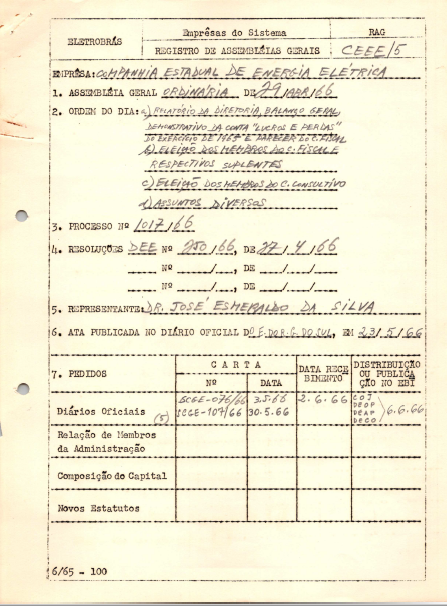 Documentos referentes à Assembleia Geral Ordinária da Companhia Estadual de Energia Elétrica - CEEE, empresa associada da Eletrobras, realizada em 29 de abril de 1966, tendo como ordem do dia o relatório da diretoria, balanço geral, demonstrativo da conta de lucros e perdas do exercício de 1965 e parecer do conselho fiscal, eleição dos membros do conselho fiscal e respectivos suplentes, eleição dos membros do conselho consultivo e outros assuntos de interesse da companhia. Inclui pauta da referida Assembleia encaminhada a José Esmeraldo da Silva, representante da Eletrobras.