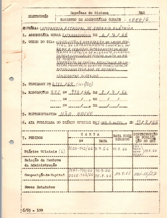 Documento referente à Assembleia Geral Extraordinária da Companhia Estadual de Energia Elétrica - CEEE, empresa associada da Eletrobras, realizada em 06 de julho de 1966, tendo como ordem do dia a discussão e aprovação do laudo pericial do levantamento contábil dos bens e serviços integrantes da Usina Termelétrica Alegrete, elaborada pela comissão de peritos eleita na AGE de 11/08/1965, aumento de capital resultante da correção monetária do ativo imobilizado, já autorizado pela AGE de 31/12/1964, e outros assuntos de interesse da companhia.