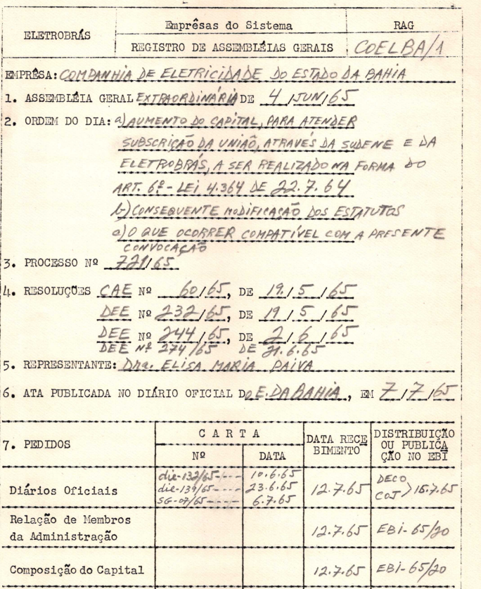 Documentos referentes à Assembleia Geral Extraordinária da Companhia de Eletricidade do Estado da Bahia - COELBA, empresa associada da Eletrobras, realizada em 04 de junho de 1965, tendo como ordem do dia o aumento do capital social, para atender subscrição da União, através da Sudene e Eletrobras, a ser realizado na forma do artigo 6º da Lei nº 4.364 de 22/07/1964, modificação dos estatutos e outros assuntos de interesse da companhia. Inclui pauta da referida Assembleia enviada a Elisa Maria Paiva, representante da Eletrobras.