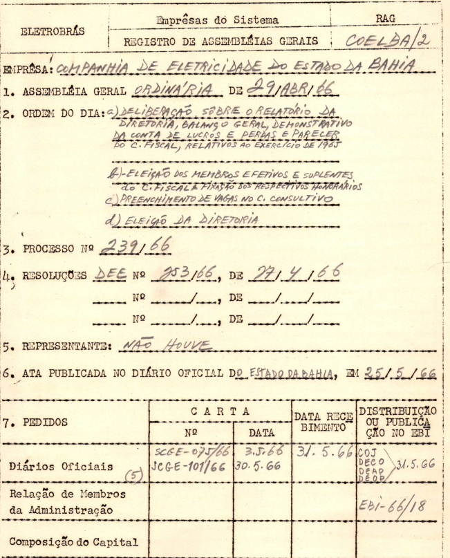 Documento referente à Assembleia Geral Ordinária da Companhia de Eletricidade do Estado da Bahia - COELBA, empresa associada da Eletrobras, realizada em 29 de abril de 1966, tendo como ordem do dia a deliberação sobre relatório da diretoria, balanço geral, demonstrativo da conta de lucros e perdas e o parecer do Conselho Fiscal, preenchimento de vagas no Conselho Consultivo e eleição da diretoria.