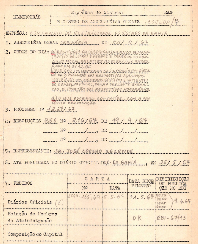 Documentos referentes à Assembleia Geral Ordinária da Companhia de Eletricidade do Estado da Bahia - COELBA, empresa associada da Eletrobras, realizada em 25 de abril de 1967, tendo como ordem do dia o Relatório da Diretoria, balanço demonstrativo de lucros e perdas, parecer do conselho fiscal, eleição de membros da diretoria e do conselho fiscal, e outros assuntos de interesse da companhia. Inclui pauta da referida Assembleia enviada a José Coelho Rezende, representante da Eletrobras.