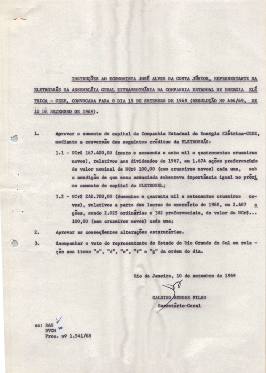 Documentos referentes à Assembleia Geral Extraordinária da Companhia Estadual de Energia Elétrica - CEEE, realizada em 15 de setembro de 1969, tendo como ordem do dia a aprovação do aumento de capital da CEEE mediante a conversão dos seguintes créditos da Eletrobras, NCr$ 167.400,00, relativos aos dividendos de 1967, em 1.674 ações preferenciais do valor nominal de NCr$ 100,00 cada uma, sob a condição de que essa associada subscreva importância igual no próximo aumento de capital da Eletrosul; NCr$240.700,00, relativos à parte dos lucros do exercício de 1968, em 2.407 ações, sendo 2.025 ordinárias e 382 preferenciais do valor de NCr$ 100,00 cada uma, aprovação das consequentes alterações estatutárias, acompanhamento do voto do representante do Estado do Rio Grande do Sul. Inclui pauta da referida reunião enviada a José Alves da Costa Júnior, representante da Eletrobras.
