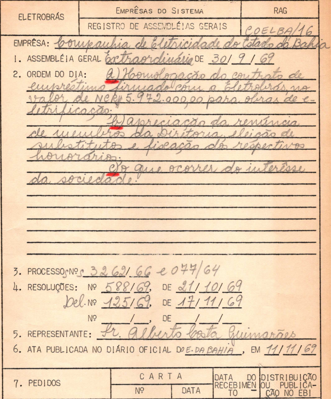 Documentos referentes à Assembleia Geral Extraordinária da Companhia de Eletricidade do Estado da Bahia - COELBA, empresa associada da Eletrobras, realizada em 30 de setembro de 1969, tendo como ordem do dia a homologação do contrato de empréstimo, firmado com a Eletrobras, para obres de eletrificação, renúncia de membros da diretoria, eleição de substitutos e fixação dos respectivos honorários, e outros assuntos de interesse da sociedade.