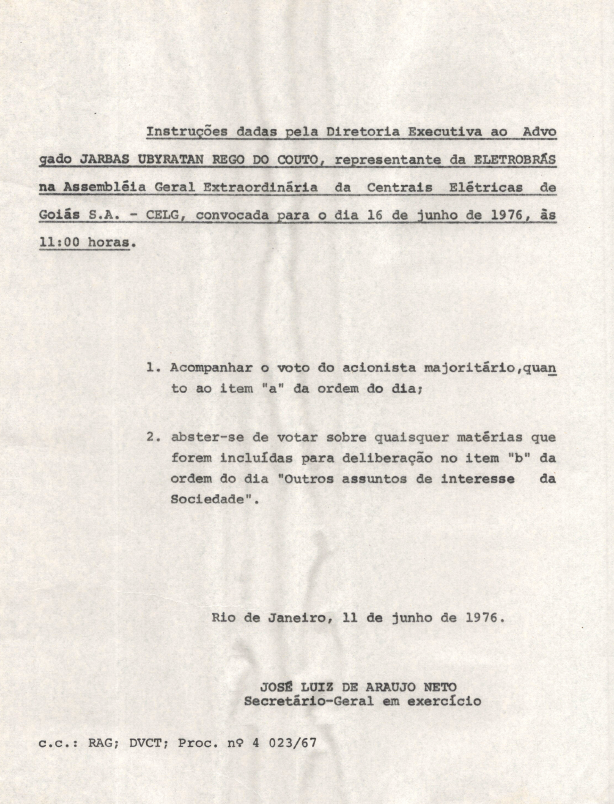 Documentos referentes à Assembleia Geral Extraordinária das Centrais Elétricas de Goiás S.A. - CELG - ocorrida em 16 de junho de 1976, tendo como ordem do dia eleição de Diretores e outros assuntos de interesse da empresa. Inclui pauta enviada a Jarbas Ubyratan Rêgo do Couto, representante da Eletrobras.