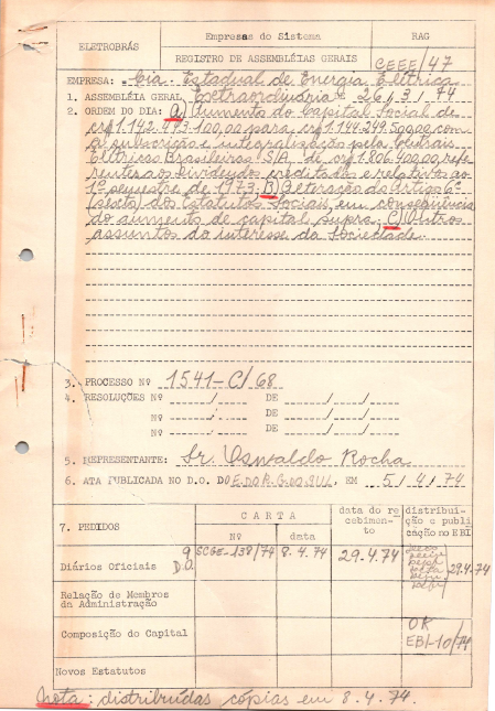 Documentos referentes à Assembleia Geral Extraordinária da Companhia Estadual de Energia Elétrica - CEEE, realizada em 26 de março de 1974, tendo como ordem do dia o aumento do capital social de Cr$ 1.142.443.100,00 para Cr$ 1.144.249.500,00, com a subscrição e integralização pelas Centrais Elétricas Brasileiras S.A. - Eletrobras de Cr$ 1.806.400,00, referentes aos dividendos creditados e relativos ao 1º semestre de 1973, alteração do artigo 6º dos estatutos sociais em consequência do aumento de capital supra, e outros assuntos de interesse da sociedade. Inclui pauta da referida Assembleia enviada a Luiz Burgos Netto, representante da Eletrobras.