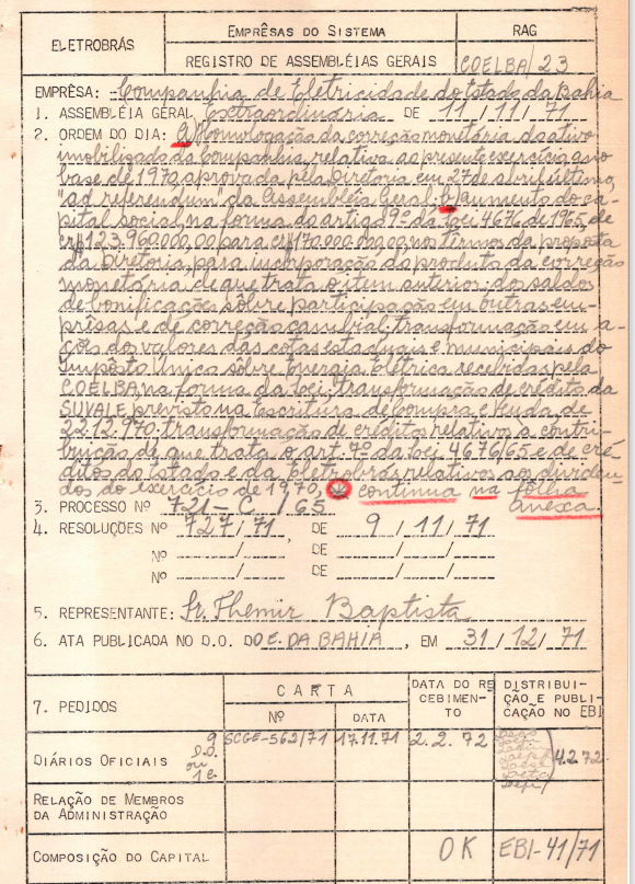 Registro da Assembleia Geral Extraordinária da COELBA de novembro de 1971