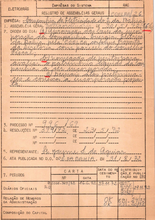 Registro da Assembleia Geral Extraordinária da COELBA de maio de 1972