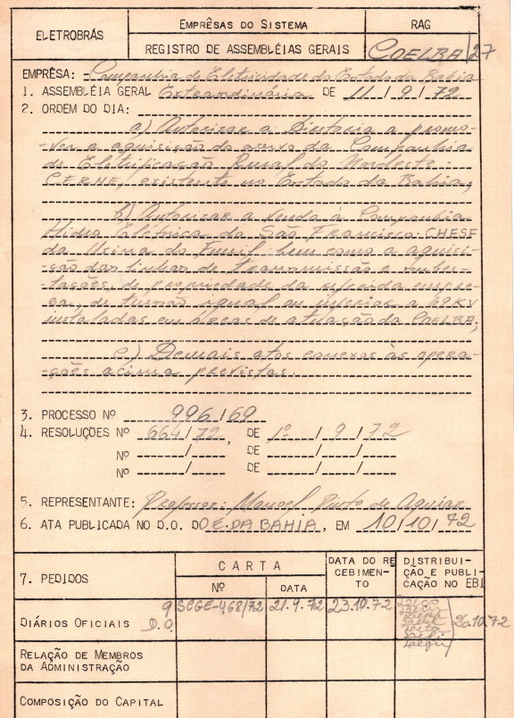 Registro da Assembleia Geral Extraordinária da COELBA de janeiro de 1973