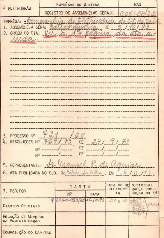 Registro da Assembleia Geral Extraordinária da COELBA de outubro de 1973