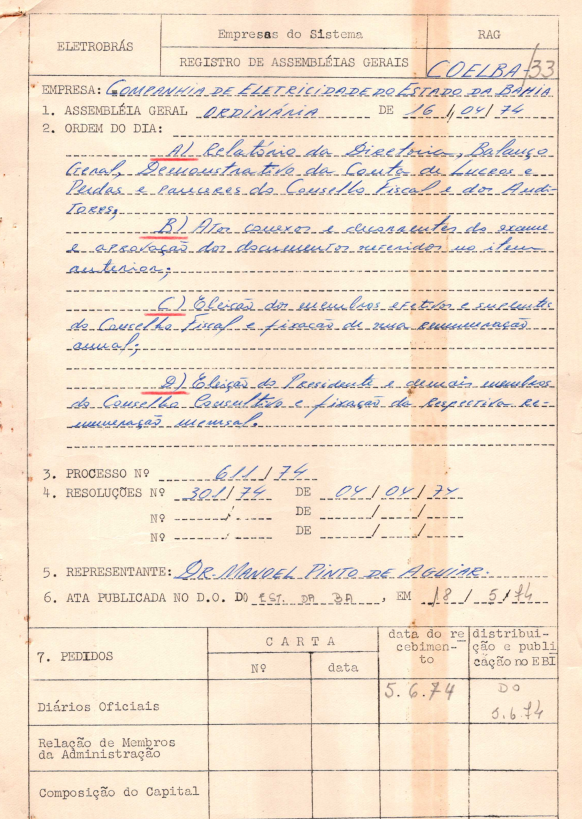 Registro da Assembleia Geral Ordinária da COELBA de abril de 1974