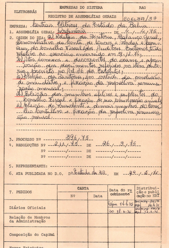 Registro da Assembleia Geral Ordinária da COELBA de abril de 1975