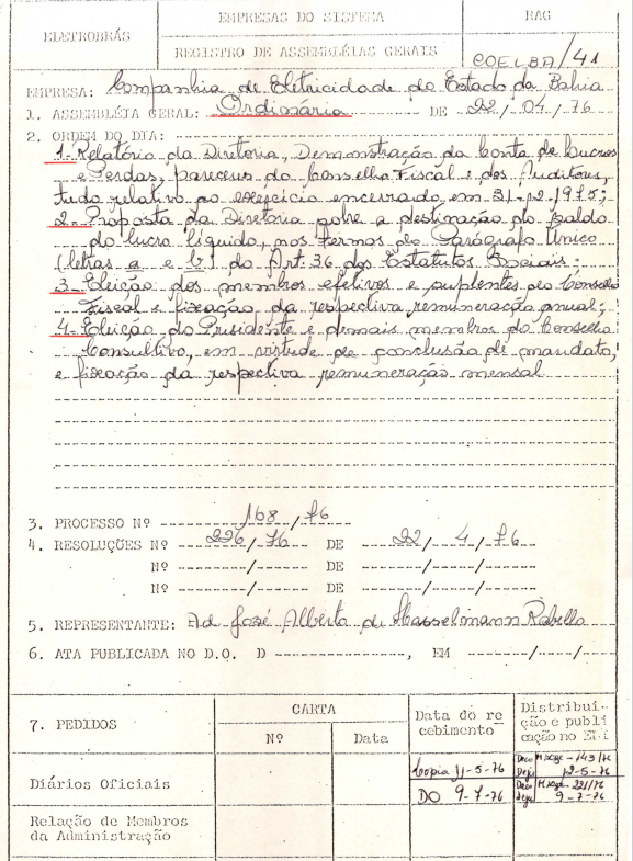 Registro da Assembleia Geral Ordinária da COELBA de abril de 1976