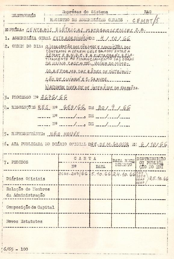 Documento referente ao registro da Assembleia Geral Extraordinária da Centrais Elétricas Matogrossenses S.A. - CEMAT - ocorrida em 4 de outubro de 1966, que tinha como ordem do dia provação dos termos e condições dos contratos a serem celebrados entre a CEMAT e a Eletrobras, relativos ao financiamento das obras da Usina Casca II, Usina do Mimoso, reformas da rede de distribuição de Cuiabá e Campo Grande e assuntos de interesse da empresa.