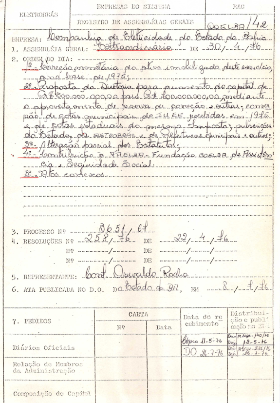 Registro da Assembleia Geral Extraordinária da COELBA de abril de 1976