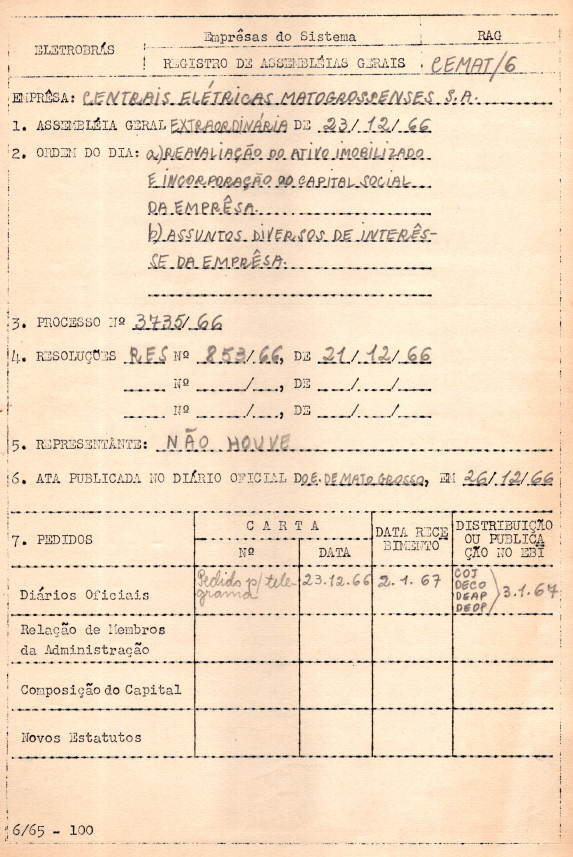 Documento referente ao registro da Assembleia Geral Extraordinária das Centrais Elétricas Matogrossenses S.A. - CEMAT - ocorrida em 23 de dezembro de 1966, tendo como ordem dia a reavaliação do ativo imobilizado e incorporação do capital social da empresa, assim como assuntos de interesse da empresa.