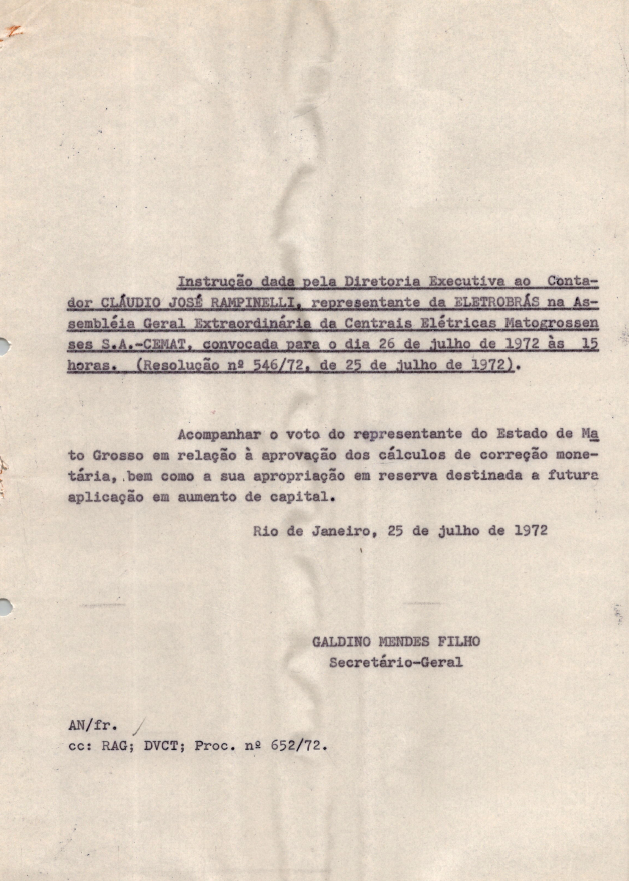 Documentos referentes à Assembleia Geral Extraordinária das Centrais Elétricas Matogrossenses S.A. - CEMAT - ocorrida em 26 de julho de 1972, tendo como ordem do dia discussão e votação da correção monetária do ativo imobilizado referente ao exercício de 1972, com base no balanço geral encerrado em 31 de dezembro de 1971 e outros assuntos de interesse da empresa. Inclui pauta enviada a Cláudio José Rampinelli, representante da Eletrobras.