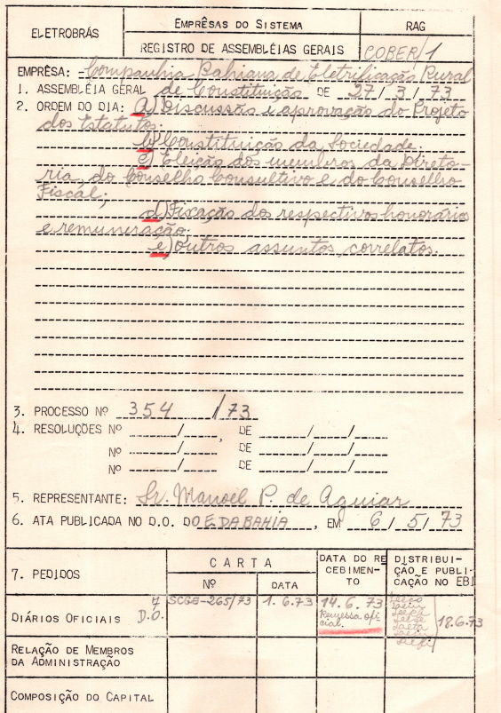 Documentos referentes à Assembleia Geral de Constituição da Companhia Bahiana de Eletrificação Rural, ocorrida em 27/03/1973, tendo como ordem do dia a discussão e aprovação de proposta de estatutos, constituição da sociedade, eleição de membros da Diretoria, do Conselho Fiscal e Conselho Consultivo.