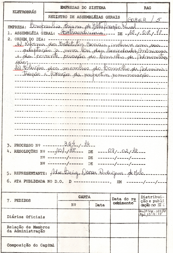 Documentos referentes à Assembleia Geral da Companhia Bahiana de Eletrificação Rural, ocorrida em 15/02/1978, tendo como ordem do dia a reforma estatutária, eleição de membros do Conselho de Administração e fixação da respectiva remuneração. Inclui pauta enviada a Luiz Oscar Rodrigues de Melo.