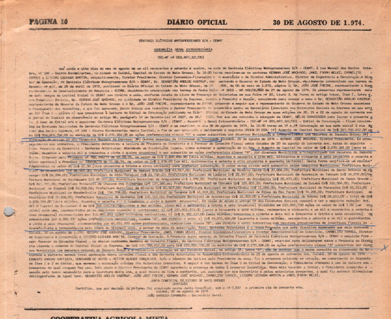 Registro da Assembleia Geral Extraordinária da CEMAT de agosto de 1974