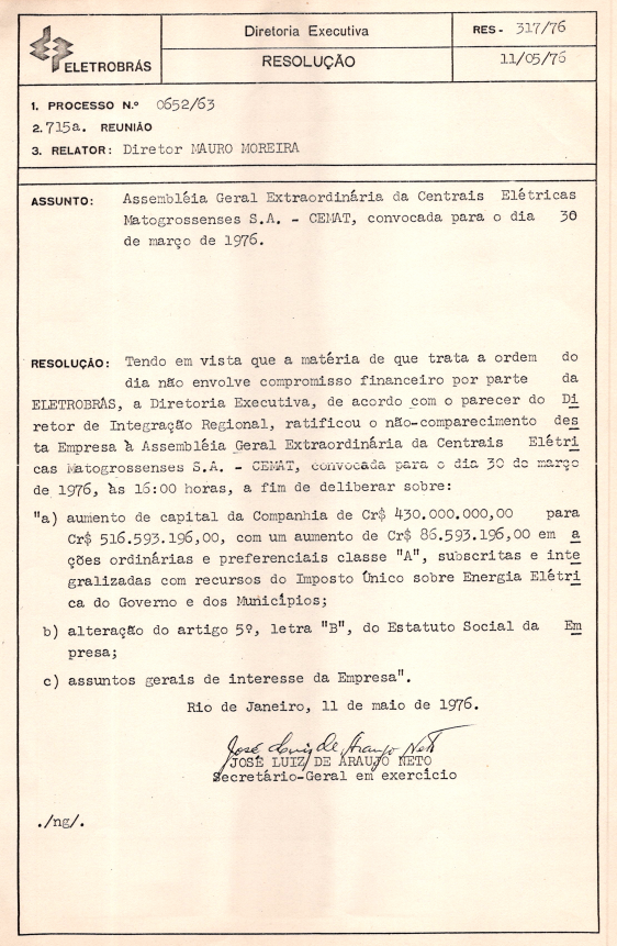 Documentos referentes à Assembleia Geral Extraordinária das Centrais Elétricas Matogrossenses S.A. - CEMAT - ocorrida em 30 de março de 1976, tendo como ordem do dia aumento do capital, alteração do estatuto social e outros assuntos de interesse da empresa.
