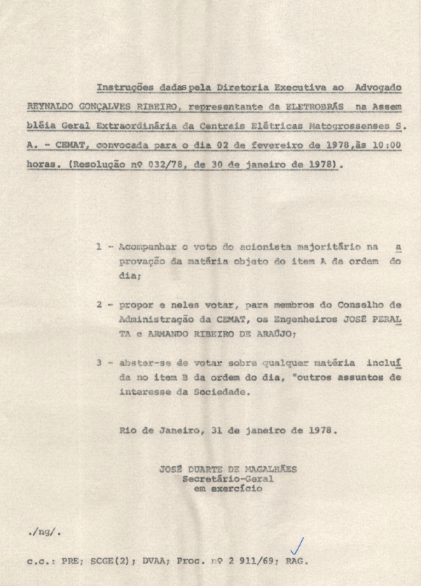 Documentos referentes à Assembleia Geral Extraordinária das Centrais Elétricas Matogrossenses S.A. - CEMAT - ocorrida em 02 de fevereiro de 1978, tendo como ordem do dia eleger os membros do Conselho de Administração, de acordo com o artigo 13º do novo Estatuto Social, e outros assuntos de interesse da empresa.