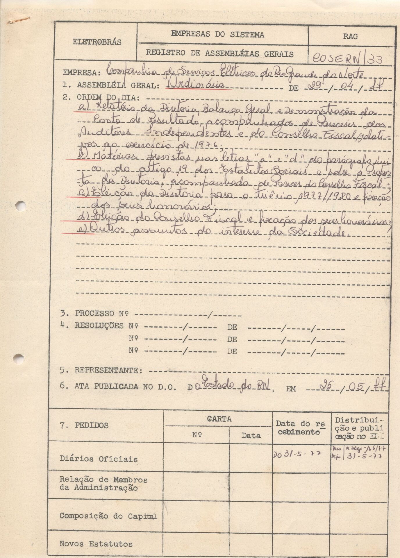 Documento referente à Assembleia Geral Ordinária da Companhia de Serviços Elétricos do Rio Grande do Norte - COSERN, empresa associada da Eletrobras, realizada em 29 de abril de 1977, tendo como ordem do dia o Relatório da Diretoria, Balanço Geral e Demonstrações da conta de resultados, com Parecer do Conselho Fiscal e dos Auditores Independentes, referente ao exercício encerrado em 1976, eleição da Diretoria, fixação dos honorários, e outros assuntos de interesse da companhia.