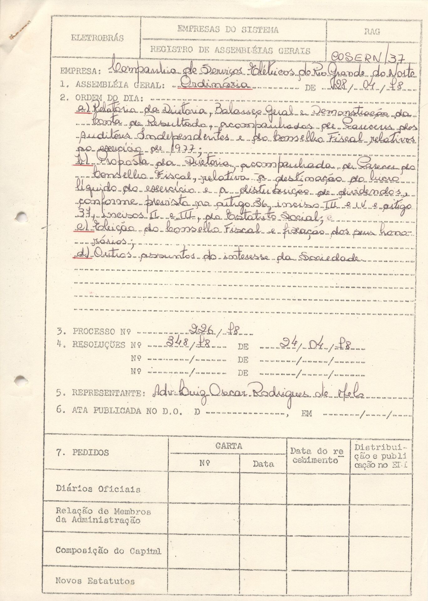 Documentos referentes à Assembleia Geral Ordinária da Companhia de Serviços Elétricos do Rio Grande do Norte - COSERN, empresa associada da Eletrobras, realizada em 28 de abril de 1978, tendo como ordem do dia o Relatório da Diretoria, Balanço Geral e demonstrações da conta de resultados, com o Parecer do Conselho Fiscal e Auditores Independentes, referente ao exercício encerrado em 1977, proposta da Diretoria relativa ao lucro líquido do exercício e distribuição dos dividendos, eleição do Conselho Fiscal, fixação de honorários, e outros assuntos de interesse da companhia. Possui pauta da referida Assembleia enviada a Luiz Oscar Rodrigues de Melo, representante da Eletrobras.
