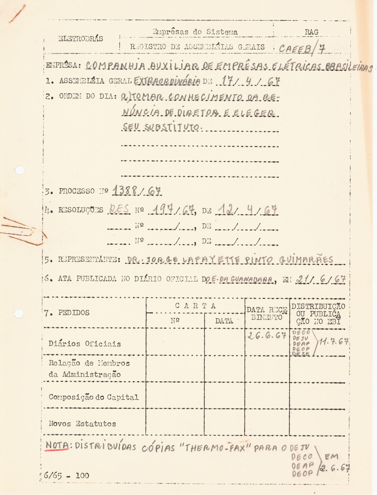 Documento referente à Assembleia Geral Extraordinária da Companhia Auxiliar de Empresas Elétricas Brasileiras (CAEEB), realizada em 17 de abril de 1967, tendo como ordem do dia o conhecimento da renúncia do Diretor e a eleição de seu substituto. Inclui cópia da ata da referida Assembleia.